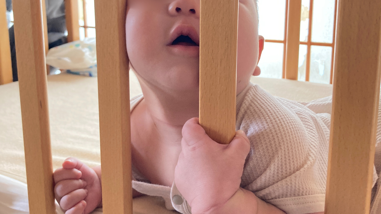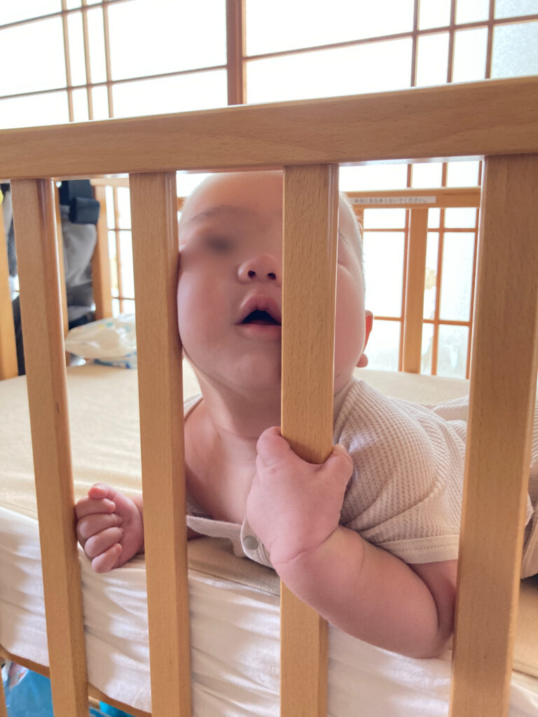 実は、第1子のときにも利用していて、そのときは 生後6か月までベビーベッドをレンタル→返却後は布団で添い寝という流れでした。ベビーベッドって長く使うイメージがあるかもしれませんが、意外と使う期間って短いんですよね。うちの場合、第一子は6か月になるころには寝返りも活発で、ベッドの中が所狭しといった感じに…そのタイミングで自然と卒業しました。