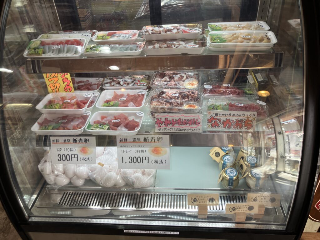 さらに、沖縄県民のソウルフードとも言える天ぷら、冷蔵ショーケースの中にはマグロの刺し身や卵、さらにはおしゃれなプリンまで。
